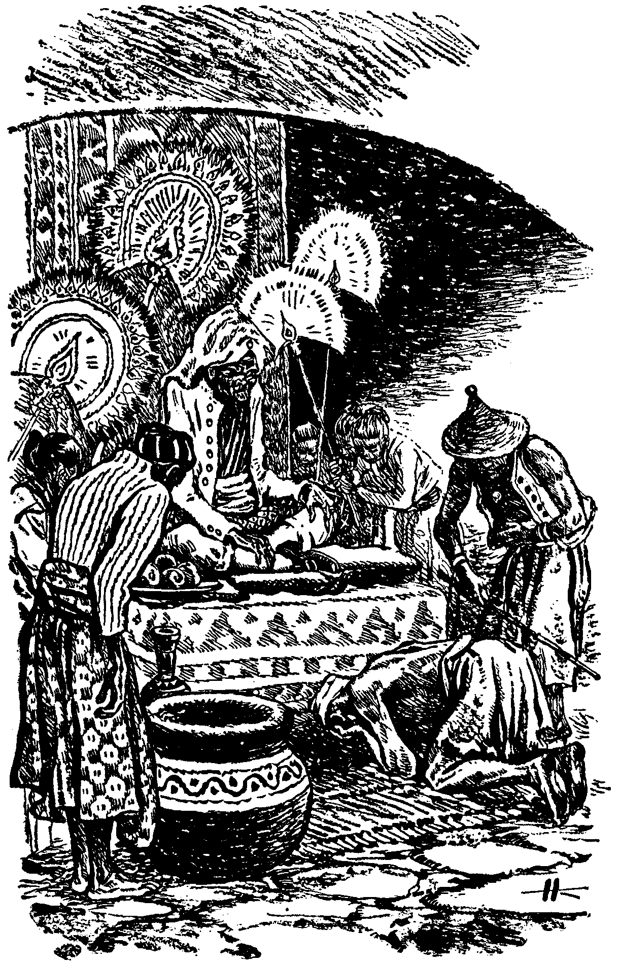 Кривобокий старик в зелёной кабайе, в плоской шапочке слуги, с пузырём на макушке выбежал навстречу Эдварду. Он лёг в пыль у головы его коня и попросил «высокого, милостивого, справедливого тувана осчастливить его хозяина и войти в дом».