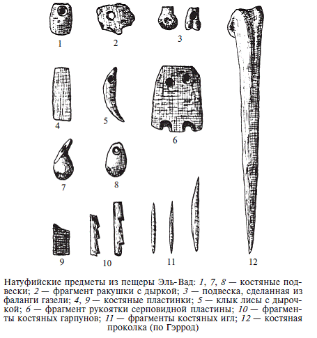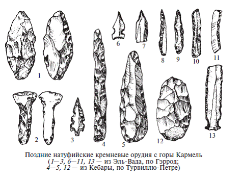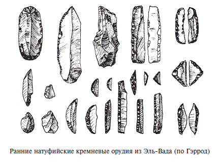 Отличительная черта натуфийской культуры, считающейся доминирующей микролитической индустрией, заключается в том, что в ней еще присутствует большое количество верхнепалеолитических орудий. После публикации ставшей классической для специалистов по первобытной истории Палестины монографии «Каменный век горы Кармель» эталонным памятником этой культуры является пещера Эль-Вад. Дороти Гэррод разделила натуфийские слои этой пещеры на две фазы, получившие названия верхне– и нижненатуфийской. Более поздние раскопки показали, что развитие материальной культуры слегка отличалось в соседних районах и некоторые различия, которые Гэррод взяла за основной принцип своей классификации, представляют собой местные варианты развития и личные предпочтения жившей в этой местности части сообщества. Все же можно различить некоторые общие признаки этой материальной культуры. На раннем этапе ее развития количество позднепалеолитических орудий было относительно больше, чем их число в поздненатуфийских слоях. Первоначально кремень обрабатывали более тщательно, многие микролиты были отретушированы с обеих сторон, причем ретушь высококачественная и тонкая (археологи называют ее хелуанской). В поздних слоях появляется значительное количество неолитических орудий, среди которых – новые артефакты, предназначенные для охоты и земледелия. Это свидетельствует о том, что в образе жизни натуфийцев со временем происходили заметные перемены.