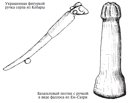 Другой тип украшенных таким образом орудий – каменные пестики в форме фаллосов, связанные с магией плодородия. Вероятно, их использовали для того, чтобы размолоть или перемешать пищу. Но наибольший интерес представляет эротическая статуэтка, найденная в пещере Ен-Сахри, расположенной в Иудейской пустыне. Она была найдена в том же слое, что и пестик в форме фаллоса. На ней изображены мужчина и женщина, занимающиеся любовью в очень странной сидячей позе. Она олицетворяет два понятия, которые и мы, как, вероятно, и натуфийцы, тесно связываем друг с другом: плодородие, с одной стороны, и органы и акт оплодотворения – с другой. В более позднем искусстве фигурки животных символизировали одновременно плодородие земли и женщины. Уже в период неолита они становятся тесно взаимосвязанными, и это соотношение между матерью людей и матерью-землей стало основой многих более поздних мифологических концепций. Как мы увидим ниже, в Иерихоне, в здании, которое многие ученые считают храмом, статуэтки богинь плодородия и животных были найдены рядом.