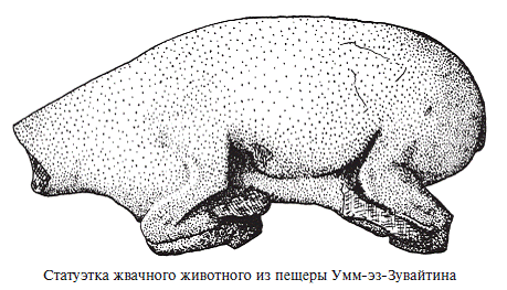 Рене Невилль нашел на Иудейских холмах два очень интересных предмета. Исследователь отнес их к ранней фазе развития натуфийской культуры. Один из них – уже описанная мною эротическая статуэтка, а второй – изображение похожего на оленя животного, возможно газели, найденное в пещере Уммэз-Зувайтина. Голова до нас не дошла, но тело очень гармонично – пропорции сохранены настолько четко, что среди всех остальных предметов натуфийской культуры аналогий этой статуэтке найдено не было. На ее поверхности сохранились остатки красной охры, которой, очевидно, она была раскрашена. Животное изображено в сидячей позе, что необычно для искусства, созданного охотниками. Предмет обрабатывался кремневым резцом, следы которого были найдены по всей его поверхности.
