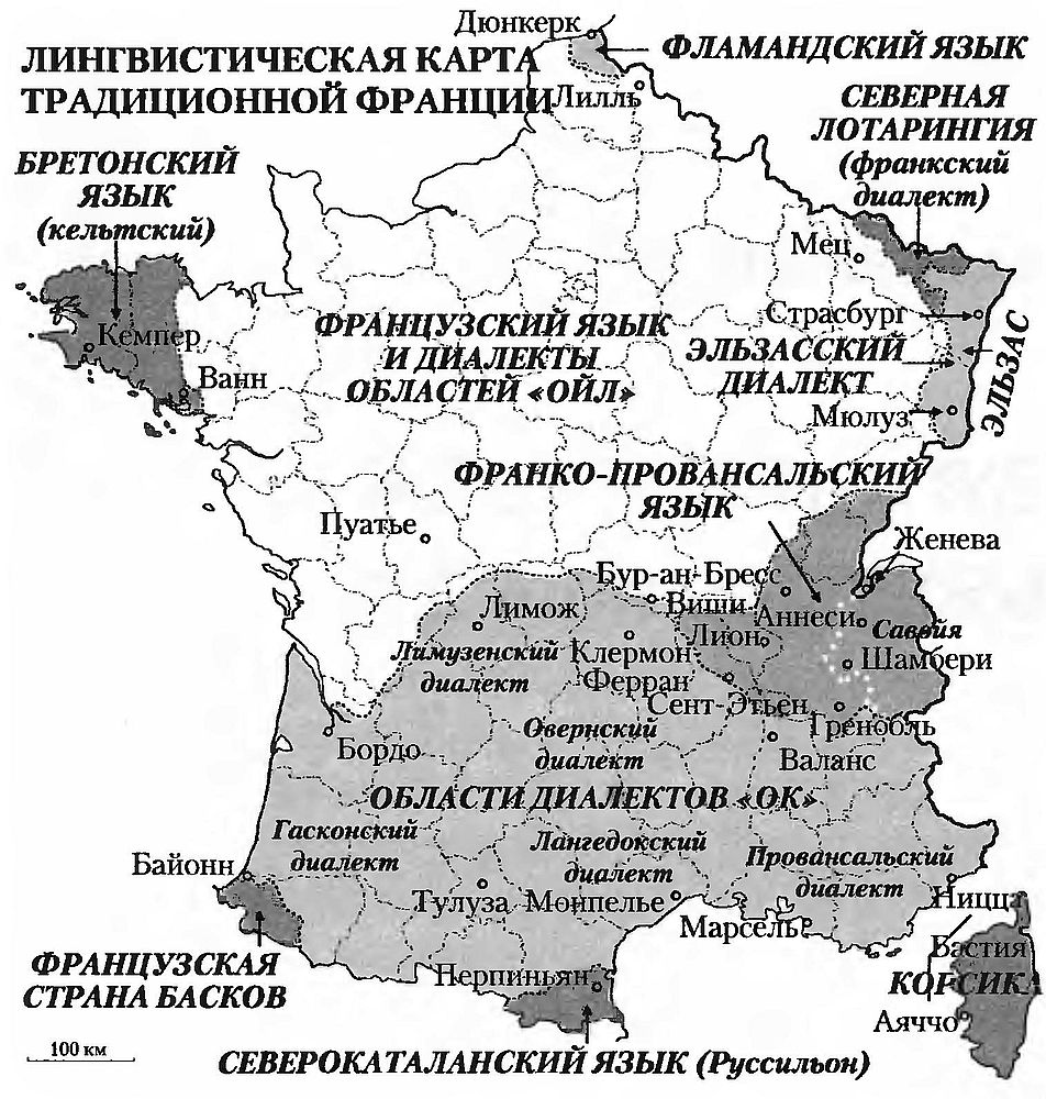 [Закрыть], на периферии (конечно, в широком смысле слова) королевства, а затем республики. Если привести исчерпывающий список, то к ним принадлежат германоговорящие жители Эльзаса и Лотарингии (их язык называется альманским, или франсийским); говорящие по-голландски жители Дюнкерка и Хазбрука; жители западной Бретани со своим кельтским языком; французские баски из Лабура, Нижней Наварры и Суля; северные каталонцы из Руссильона (Восточные Пиренеи); корсиканцы; говорящие на франко-провансальском диалекте в Савойе и Дофине, и наконец окситанцы, находящиеся за приблизительно очерченной границей, к югу от которой лежат Бордо, Лимож, Клермон-Ферран, Валенс и прованские Альпы[5]5
