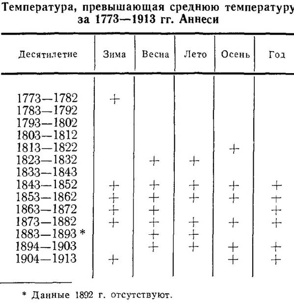 Знак «+» означает, что за десятилетний период средняя температура того или другого сезона или всего года была выше средней за период 1773—1913 гг. Когда температура была равна или ниже этой средней, никакой знак не ставился.