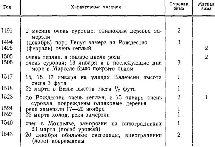 Напомним, что, например, зима 1494 г. – это декабрь 1493 г., январь и февраль 1494 г. Суровая зима: 1 – отдельные холода, 2 – суровая, 3 – очень суровая; мягкая зима: 1 – мягкая, 2 – очень мягкая.