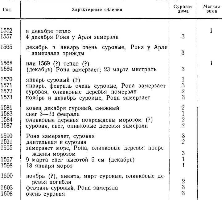 Я сам собрал для юга Франции ряды различных данных за XVI в., свидетельствующих о характере зим. Эти ряды указывают на факты, связанные с суровостью (или мягкостью) зим: гибель оливковых деревьев вследствие холодов, замерзание Нижней Роны и появление на ней льда, выдерживающего конькобежцев и повозки.