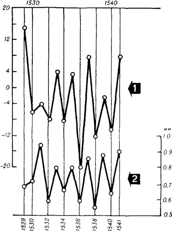 Рис. 28. Даты сбора винограда во Франции и Швейцарии (1) и дендрологическая кривая для дуба в Оденвальде (2) в 30-е годы XVI в. Кривые прекрасно согласуются между собой. На оси ординат (слева) – отклонение дат сбора винограда от средней (в днях; использованы цифры, приведенные в Приложении 5, раздел 2, графа Г) и (справа) толщина годичных колец прироста дуба (в мм; кривая 2 заимствована из [187]).