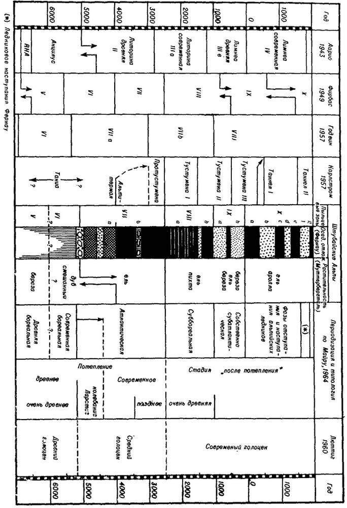 В таблице (заимствованной из [258]) схематически представлена (в графе Штубайские Альпы, осадочные отложения Фернау) стратиграфия торфяника Бунте Моор: черный цвет – слои торфа (отступание ледника); белый цвет с черными точками – моренные пески (наступание ледника), а также послеледниковые и послеоптимумные периодизации различных (Аарио – для Балтики, Фирбаса и Годвина по пыльце – для Западной Европы, Карлстрома – для Аляски и т.д.).