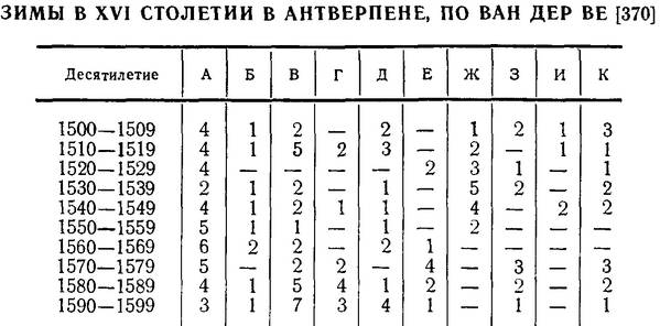 5. С другой стороны, после 1550 г. обнаруживается уменьшение числа «теплых и очень теплых» зим (графа К) от 9 (из 32) до 6 (из 27); и особенно «очень теплых» – от 4 (из 32) до 0 (из 27).