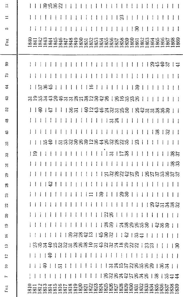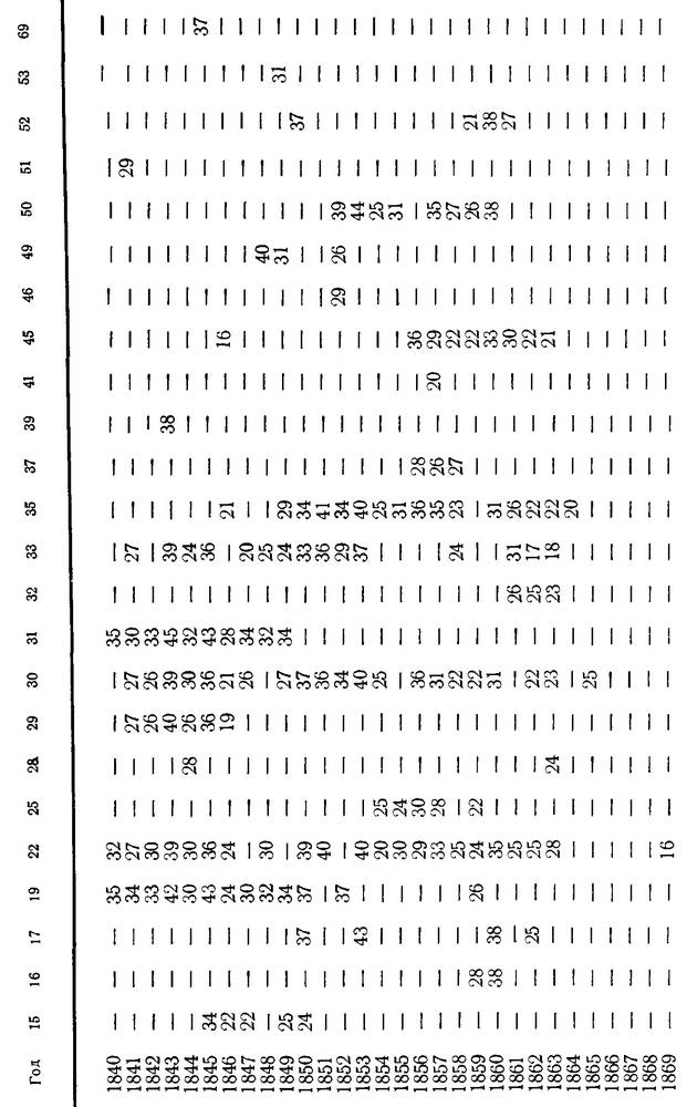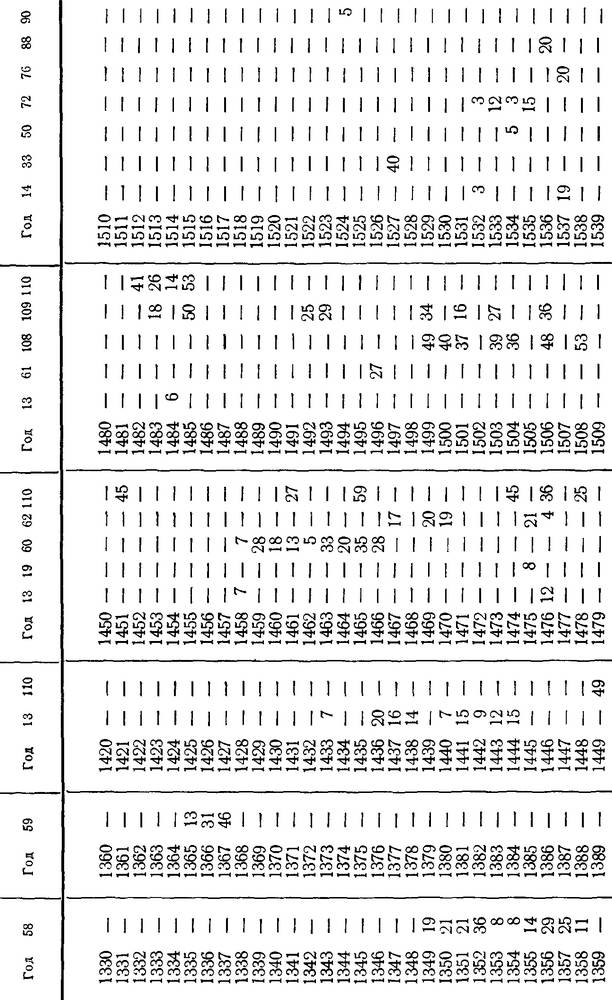 б) Таблицы дат сбора винограда в отдельные годы в различных местностях (графа обозначена номером, соответствующим определенной местности). В таблице приведены даты сбора винограда в соответствующей местности, отсчитанные от 1 сентября (цифра 28 соответствует 28 сентября, 34 – 4 октября; 0 – 31 августа; -1 – соответствует 30 августа и т. д.). Даты до 1583 г. (год введения в Лангедоке нового календаря) выправлены автором в соответствии с грегорианским календарем.