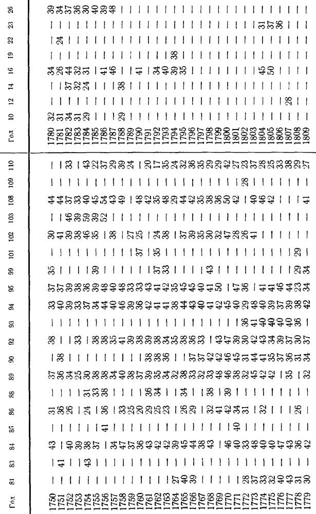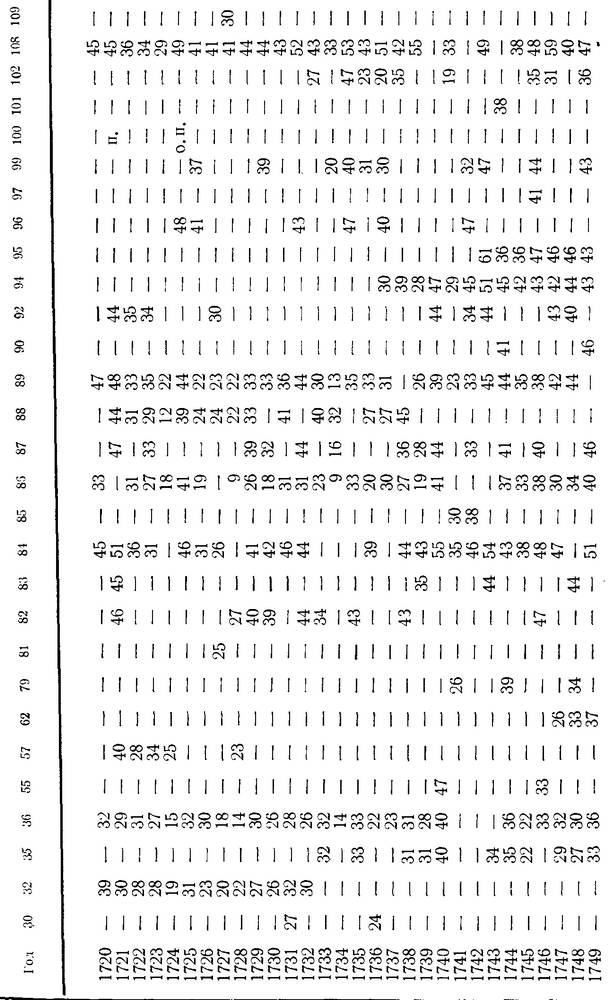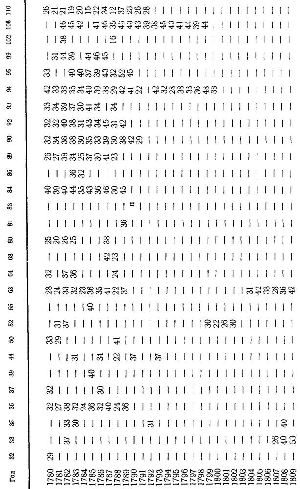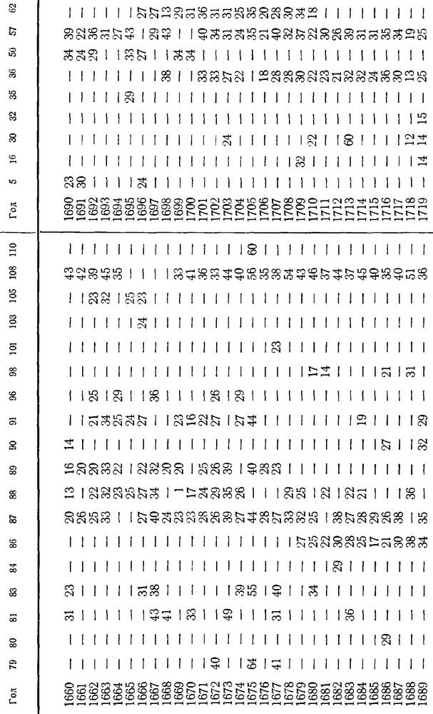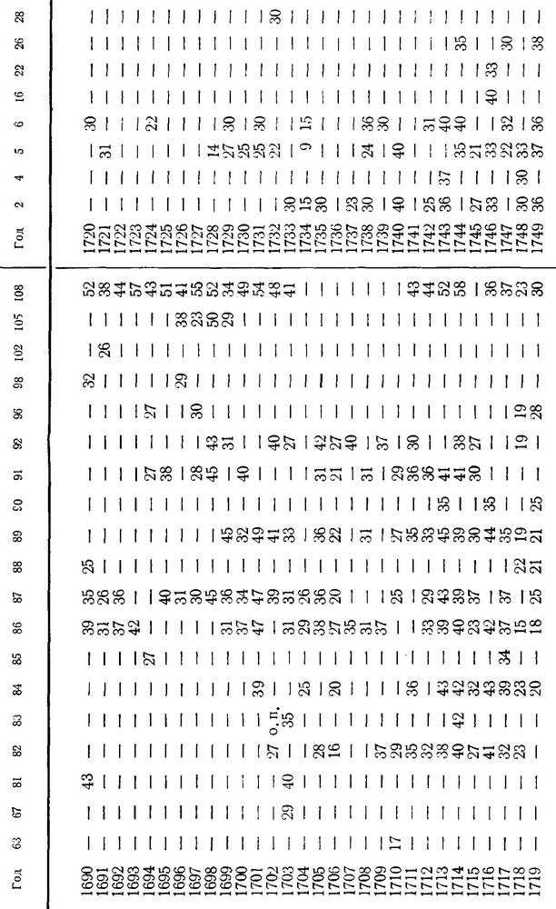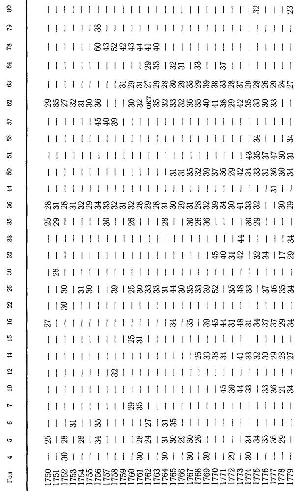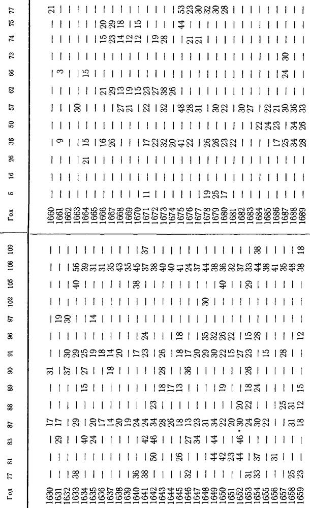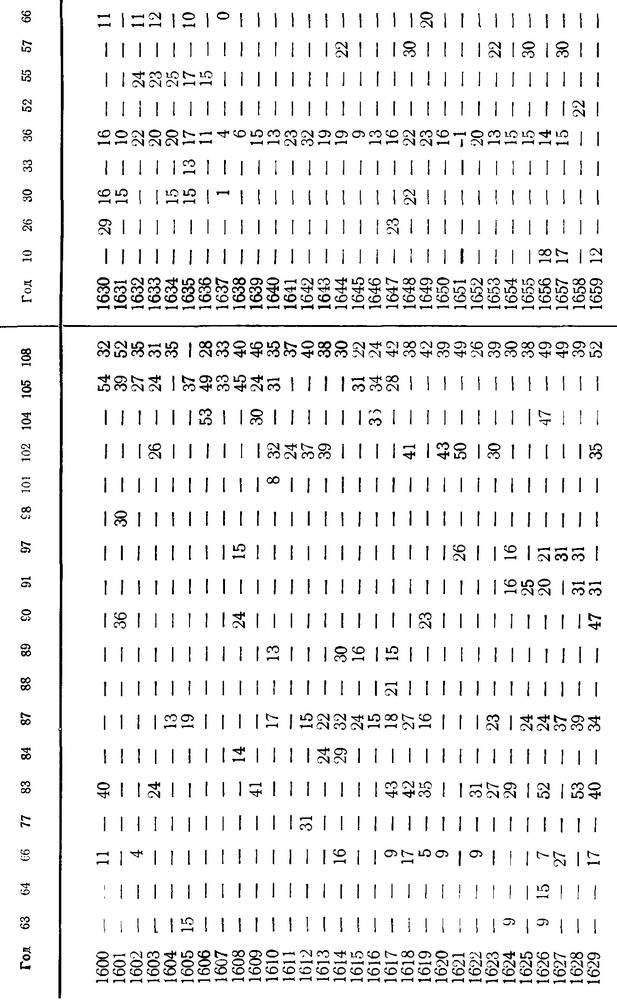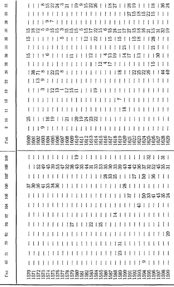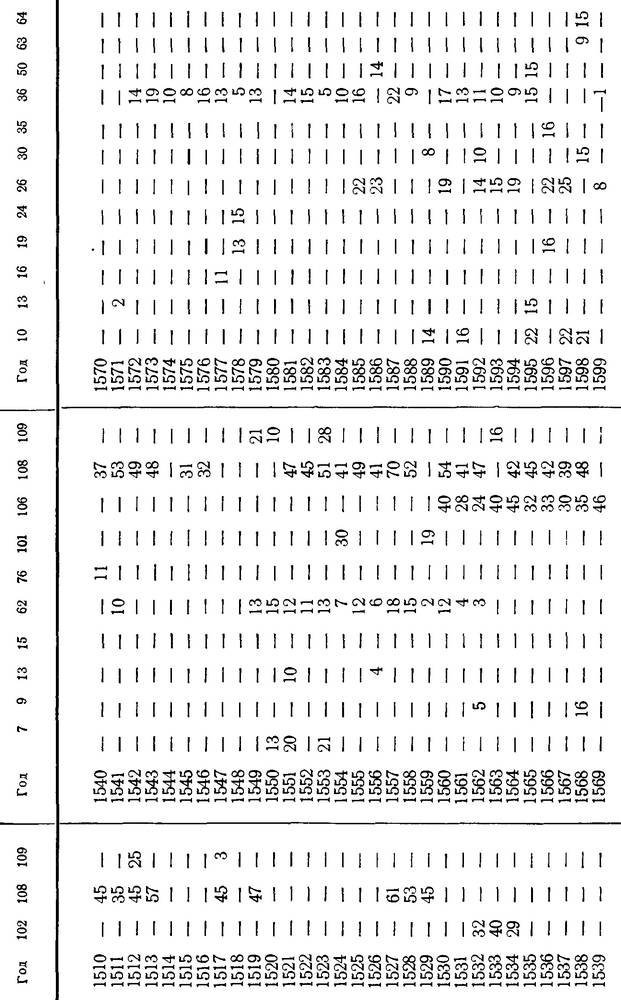 Примечание. Цифра 71 в графе 26 за 1602 сомнительна и не учтена в средних, которые приводятся в разделе 2 настоящего приложения, оп – очень поздняя дата, п – поздняя.