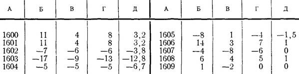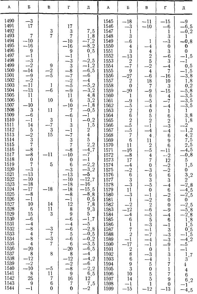 В графе А указаны годы. В графе Б приведены сводные средние [I] (в днях), подсчитанные автором по местным отклонениям от вековых локальных средних дат сбора винограда (1490—1609), для шести локальных станций (центр—север): Дижон, Сален, Бурж, Лозанна, Обонн, Лаво. Местные данные заимствованы в [11].