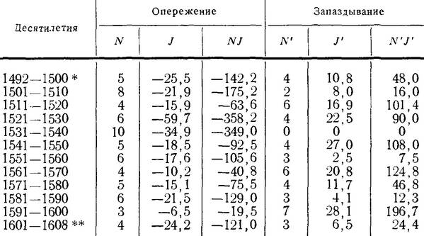 J – число дней опережения средней даты – сумма всех отрицательных отклонений (в днях опережения), которые характеризуют вышеупомянутые годы с ранними датами. Например, если взять десять лет, 1501—1510 гг. (графа Д таблицы раздела 2), то J будет равно (−6) + (−4) + (−5,2) + (−3,2) + (−1,8) + (−0,5) + (−1) + (−0,2) = −21,9.