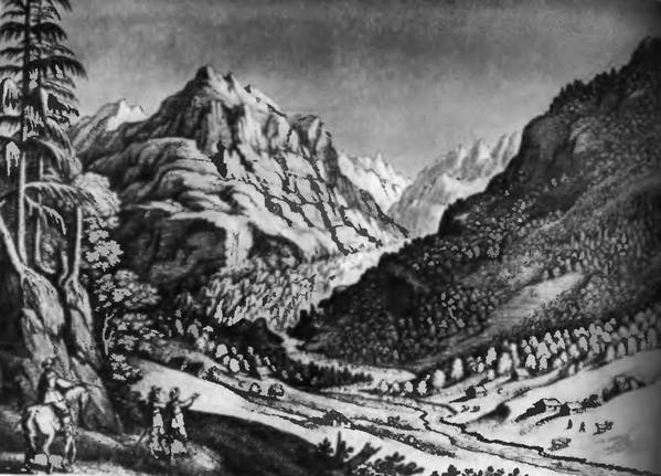 На переднем плане – Белая Лючин, вытекающая из ледника. В левой части гравюры – Меттенберг, в центре – Фишерхорн, направо – Херили (небольшое продолжение Эйгера).