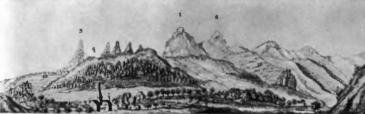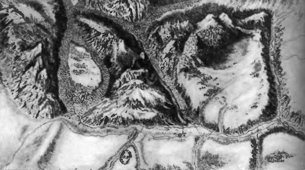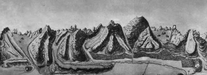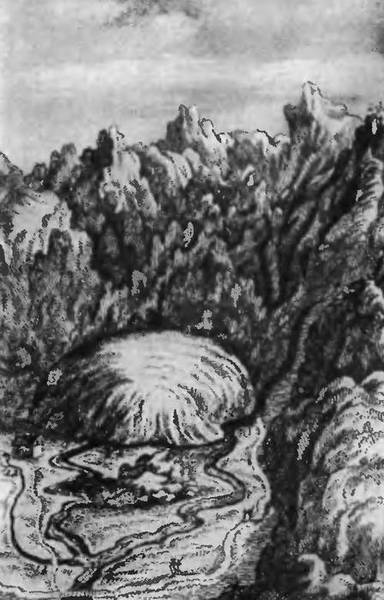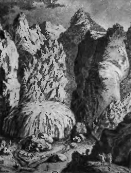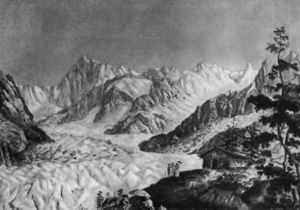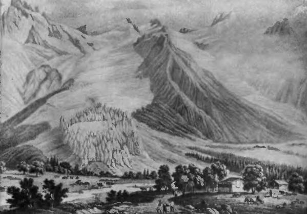 Рисунок Жалабера (1767 г.), выполненный с натуры во время одного из его путешествий с Соссюром, был опубликован в [328]. Насколько мне известно, это наилучшее и наиболее точное из старинных изображений, относящихся к ледникам Монблана. Обратите внимание (справа внизу) на «хижины земледельцев, которые обрабатывают поля возле ледников».