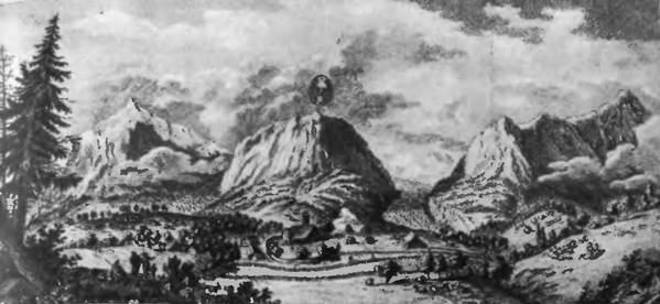 Два больших Гриндельвальдских ледника, спускающиеся около 1719—1720 гг. вплоть до главной долины. (Рисунок Мейера около 1720 г., гравюра заимствована из [162] и [163].)