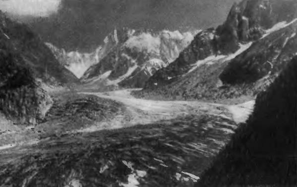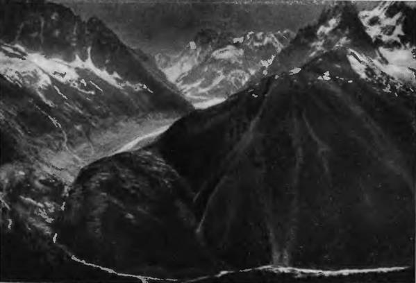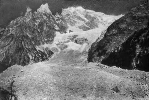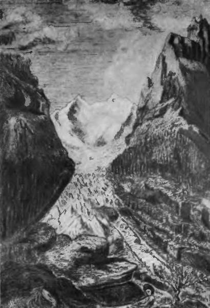 Фотография на (рис. XXVI) была сделана точно с того же места, откуда Обер выполнял свой рисунок: нависшая трапециевидная скала справа в нижней части обоих изображений доказывает это. На этой фотографии ледник отступил, он едва различим с правой стороны, позади большого скалистого и мрачного склона пика Комбаль. Отступание составляет не менее 500 м.