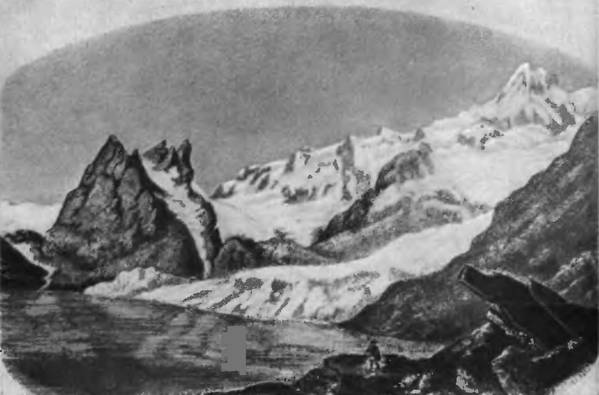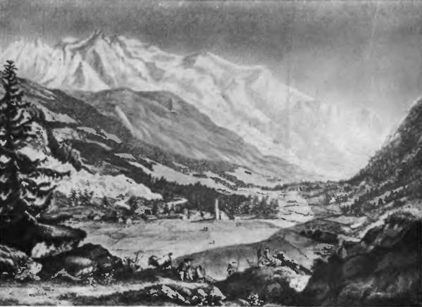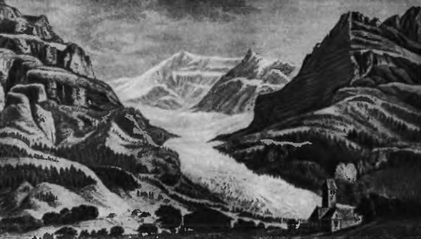 На этой замечательно точной гравюре Хакерта ледник Аржантьер располагается совсем близко к церкви того же названия. Он простирается на 1005 м дальше, чем 26 октября 1911 г. [266в].