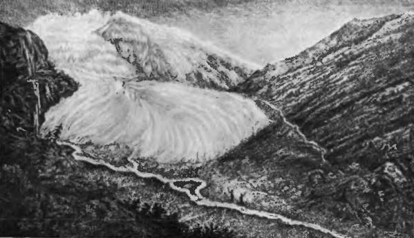 Нижннй Гриндельвальдский ледник, огромный и угрожающий, с торчащими сераками, около 1640 г. сильно продвинувшись по сравнению с современным его положением, полностью занимает ущелье и боковую долину, вплоть до выхода ее в долину, называемую Гриндельвальдской [265].