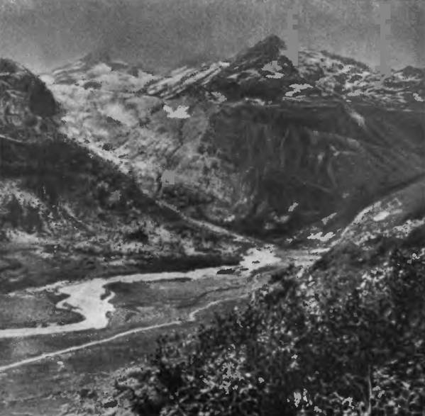 Картина Линка, хранящаяся поныне в мэрии Шамони [266в]. На переднем плане – реки Арв и Арвейрон. Мер-де-Гляс, «изгибающийся в виде руки» (Гюго), опускается «почти до равнины». На подобной же фотографии, снятой Муженом в 1911 г. [266в] Мер-де-Гляс полностью исчез с этого пейзажа, оставив лишь морены на том месте, где в начале XIX в. находился конец его языка.