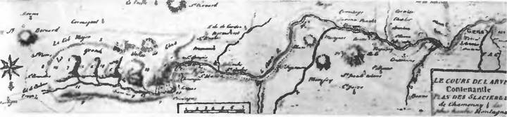 Эти наброски выполнены в 1742 г. на местности Мартелем (досье «Королевство Сардинии и Савойи», номера vb1; vb1 и vb2 очень богаты убедительными изображениями «малого оледенения» в Альпах). Несмотря на недостатки, этот рисунок обладает несомненной наглядностью: ледник Буа (12) виден «от церкви Шамони... в 1742 г.». Это уже классический контраст с современной ситуацией.