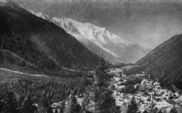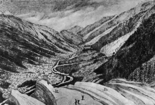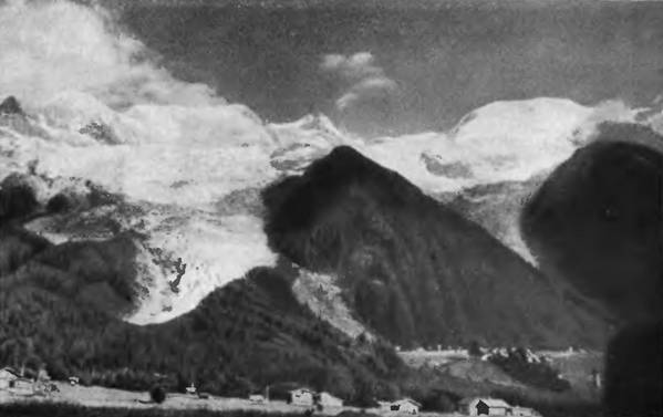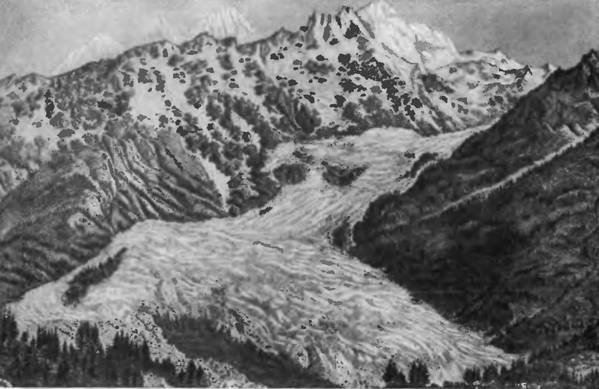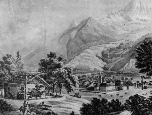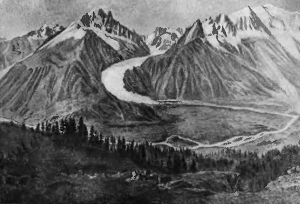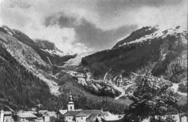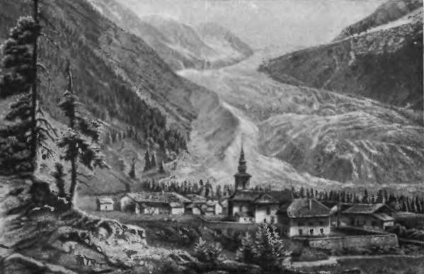 На этой гравюре, принадлежащей швейцарскому или немецкому автору, имеются надписи: «Nach Photographie arrangirt von L. Rohdock; G. M. Kurz Sculps. Druck und Verlag von G. G. Lange». Ледник Аржантьер только начинает отступать, ои еще образует характерный зигзаг, о котором около 1870 г. говорил Соссюр. Его фронт проходит близко от равнины и деревни.
