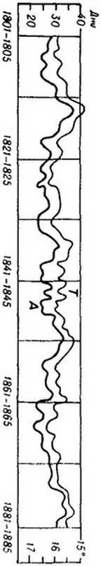 В самом этом факте нет ничего ни удивительного, ни сенсационного: фазы убывания солнечной активности такого же типа, как в XVII столетии, отмечались между 1795 и 1825 гг. [46, стр. 182, рис. 8] и между 1875 и 1915 гг.