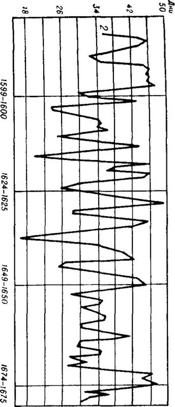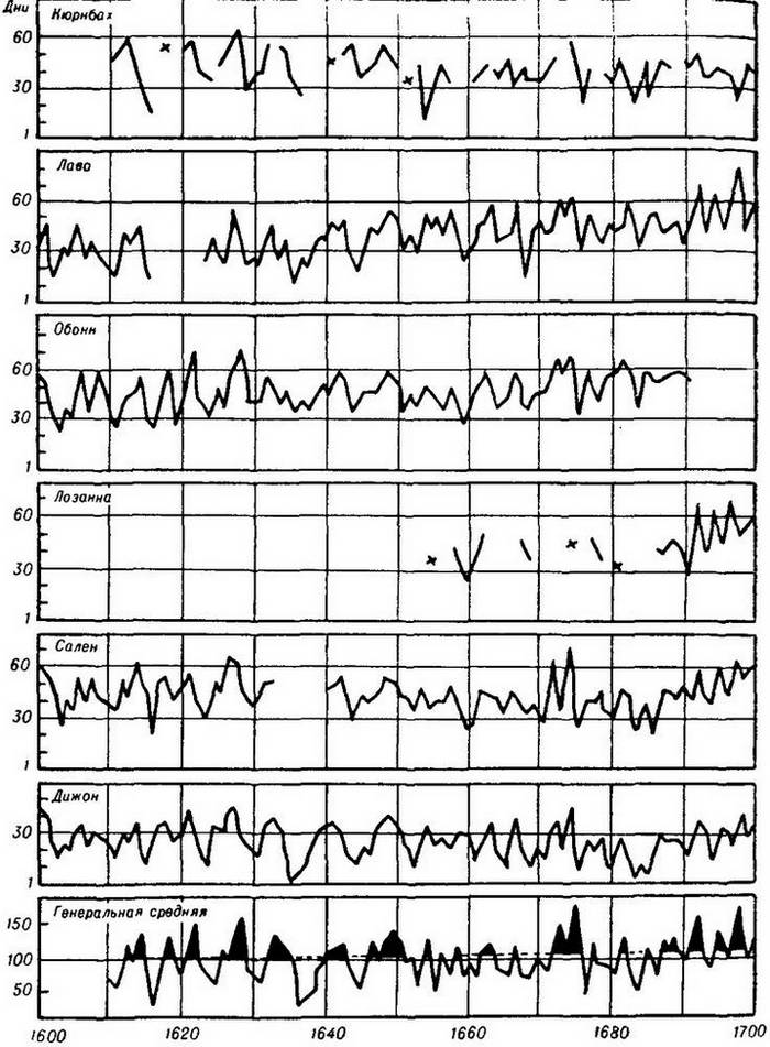 График, представленный на рис. 6, построен мною по данным, опубликованным Анго. На этом графике на оси ординат нанесены даты сбора винограда (с началом отсчета от 1 сентября) в ряде городов или районов, расположенных между Альпами, Шварцвальдом и Центральным массивом. Ось абсцисс – ось времени (с 1600 по 1800 г.).