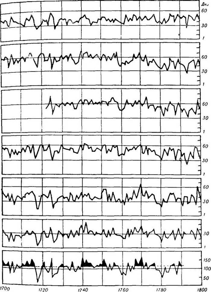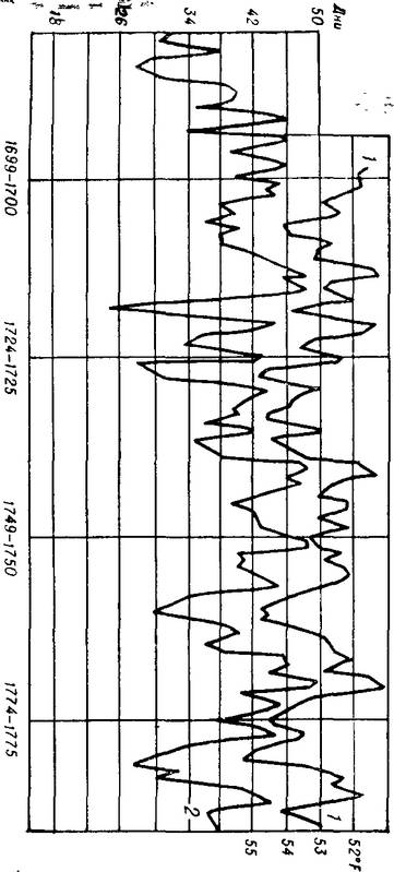 Инструментальные наблюдения подтверждают эту хронологию хода температуры. Один из наиболее старых рядов метеорологических наблюдений в центре Англии, опубликованный Гордоном Менли [247], позволяет построить кривую ежегодных температур за период с 1 марта по 1 сентября для интересующего нас XVIII в. Она очень близка к кривой дат сбора винограда (рис. 5). Это соответствие не только просто подтверждает фенологический ряд: обе кривые изображают историю флуктуаций температуры в теплое время года в XVIII в. на северо-западе Европы. «Ряд Анго» приобретает особую ценность в связи с этим сопоставлением: для периода до XVII столетия из-за отсутствия непосредственных наблюдений он становится единственной метеорологической кривой, которой мы располагаем.