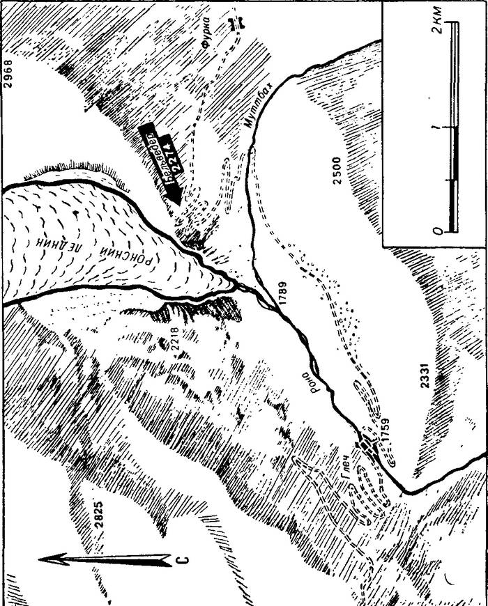 Рис. 12-В. Pecten Ронского ледника, преграждающий Муттбах и распространяющийся на долину Глеч.