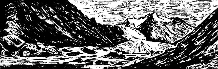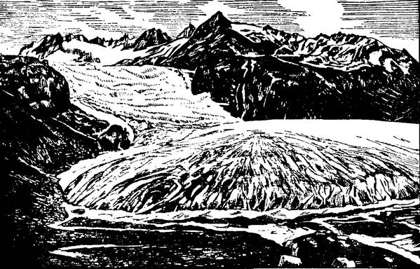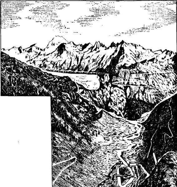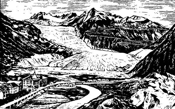 Снято со склонов Ленгисграта, левый берег. Ронский ледник заметно отступил. Он покрывает еще толстым языком скалистый ригель, но впервые в истории своей иконографии (с 1705 г.) не преграждает долину Муттбах н не распространяется в виде pecten в долину Глеч [262].