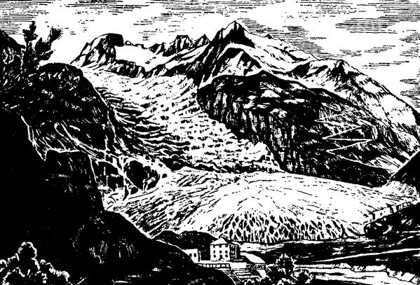 Рис. 12-Ж. Pecten Ронского ледника, преграждающий долину Муттбах и распространяющийся в долину Глеч в 1850 г. Старинная гравюра, автор которой, вероятно, воспользовался «дагерротипом».