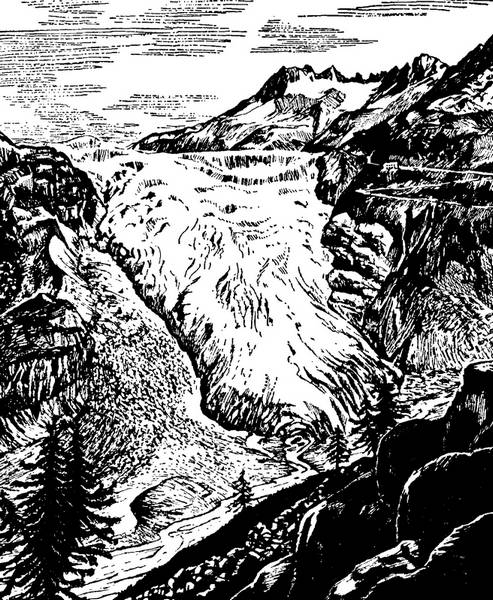 Рис. 12-Д. Pecten Ронского ледника, преграждающий долину Муттбах и распространяющийся на долину Глеч в 1848 г. Перед ледником (слева) концентрические морены, как память о наступаниях ледника в XVII в. и 1820 г. Акварель Хогарда, выполненная 16 августа 1848 г. [262].