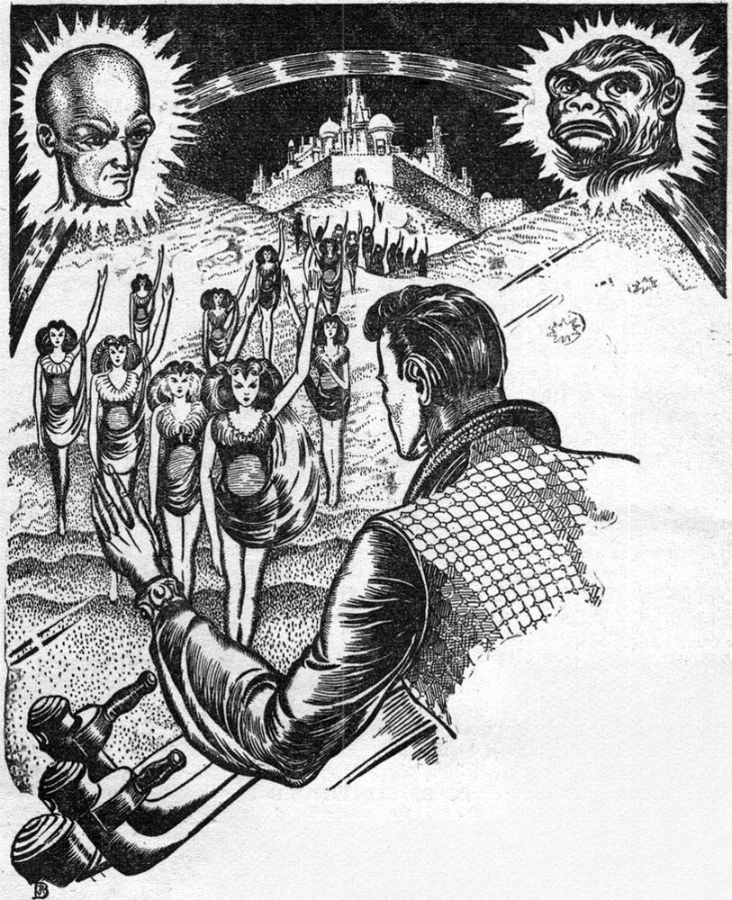 Вскоре из города показалась вереница человекоподобных фигур и направилась к кораблю. Они были так поразительно похожи на него самого, что Дэйв ахнул от изумления. У них были тонкие заострённые уши, узкие рты, длинные зеленоватые волосы и довольно длинные руки и ноги, но в остальном они были похожи на людей.