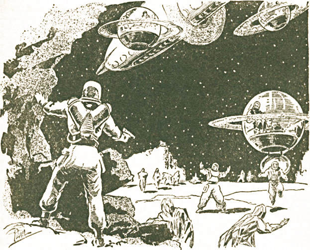 Они обнаружили, что он отсутствует на корабле, и пропавший скафандр подсказал им, что он уже внизу. Донован бежал изо всех сил, а гудящий гирокар мчался за ним. Еще три гирокара вывалились из зависшего над поверхностью луны корабля и принялись окружать его.