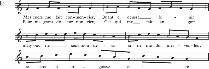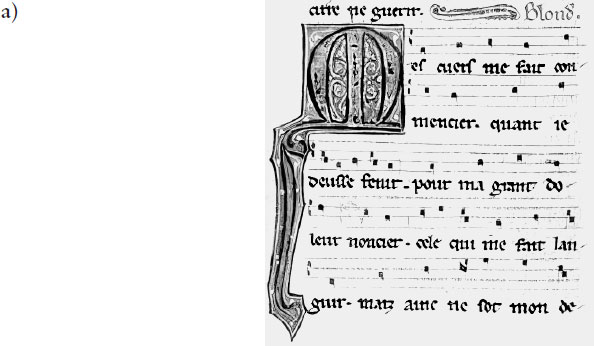 Песня трувера конца XII века Блонделя де Неля. a) Первые две строки в оригинале. b) Современная транскрипция всей песни. Поэт поет о неразделенной любви на чрезвычайно свободный и красивый мотив. В оригинале такие элементы песни, как ритм и характер аккомпанемента (если он был), оставлены на усмотрение исполнителя