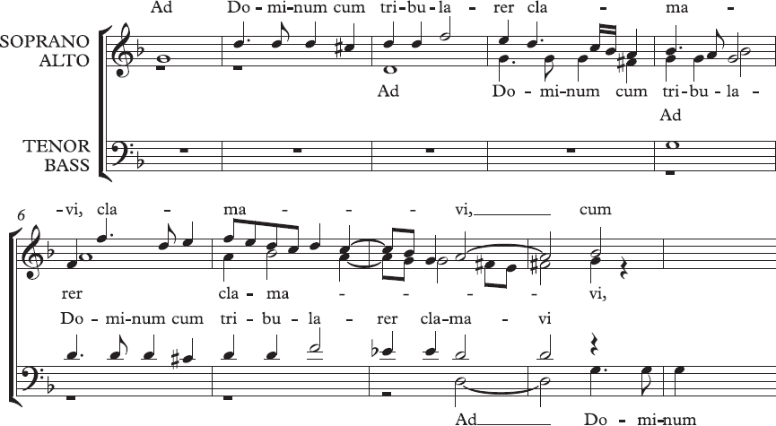 Начало мотета Палестрины. Музыка в дорийском ладу, на словах «Ad Dominium» используется имитационный контрапункт в каждом голосе, что приводит к диссонансу в альте на третьей доле восьмого такта