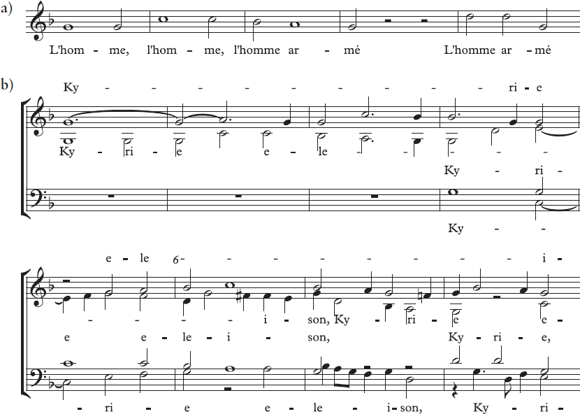a) Первые фразы песни «L’Homme armé» и b) начало Missa L’homme armé французского композитора XV века Антуана Бюнуа. Бюнуа прямо использует мелодию песни в теноре, в то время как верхние, более расцвеченные голоса, ссылаются на нее, как, например, в начальном пассаже с восходящей квартой в двух верхних голосах