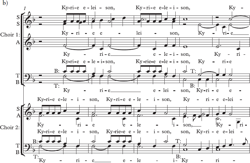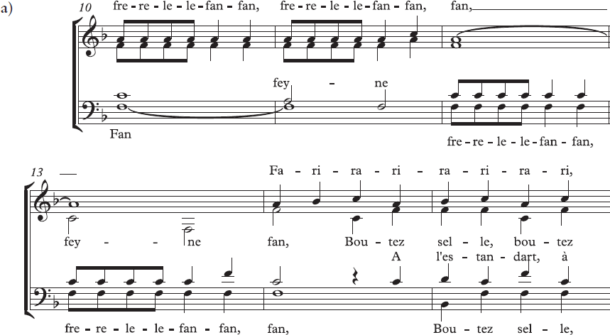 Техника пародийной мессы. Пассаж а) из шансона «Война» (La Guerre) французского композитора Клемана Жанекена, одной из многих песен, в которых удовольствие от пения достигается с помощью имитации звуков реальной жизни, в данном случае – сражения; b) это часть «Kyrie» из мессы испанского композитора второй половины XVI века Томаса Луиса де Виктории Missa Pro Victoria, куда вписано несколько музыкальных идей из шансона Жанекена, которые снабжены иным текстом и исполняются с заметно большей вокальной выразительностью: музыка преображается, служа новой задаче