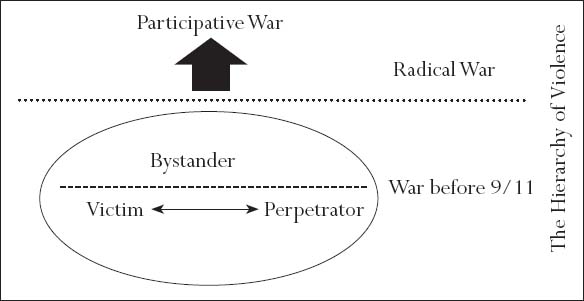 В XXI веке иерархия войны разрушает тринитарную модель Клаузевица. Страсти людей перенаправлены и искажены в цифровых призмах четвертого измерения. Каждый участвует в войне, если он подключен к Интернету. Это устраняет разделение на гражданских и военных, которое определяло понимание войны до 11 сентября. Эволюционирующий пунктик войны усложняет процесс достижения социального консенсуса по поводу войны. Это не мешает правительствам и вооруженным силам определять политические цели войны, но открывает вопросы о том, как широкие слои общества используются государством. Радикальная война подразумевает уничтожение гражданского населения, в результате чего каждый человек становится средством реализации политических целей, независимо от его статуса комбатанта. ИГ не признает различий между комбатантами и гражданскими лицами (Ingram, Whiteside and Winter 2020); каждый должен выбрать свою сторону.