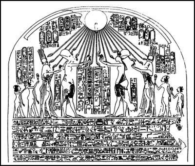 Рис. 3. Эхнатон и Нефертити, поклоняющиеся Атону в образе солнечного диска. Изображение на пограничной стеле в Тель эль-Амарне.