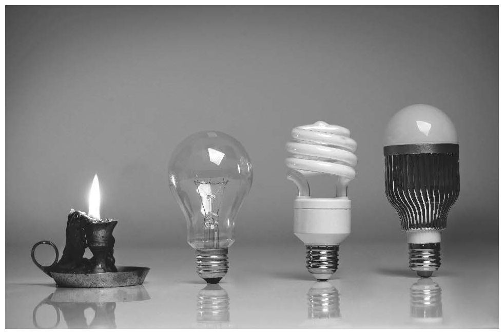 Развитие осветительных технологий: свеча, лампа накаливания, люминесцентная лампа и светодиодная лампа