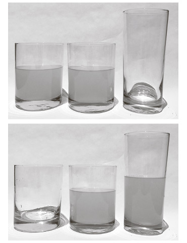 Рис. 2.1. Дошкольник скажет, что в высоком узком стакане справа (нижняя картинка) больше жидкости, чем в низком широком стакане слева (верхняя картинка), даже если он своими глазами видел, как жидкость перелили из одного стакана в другой