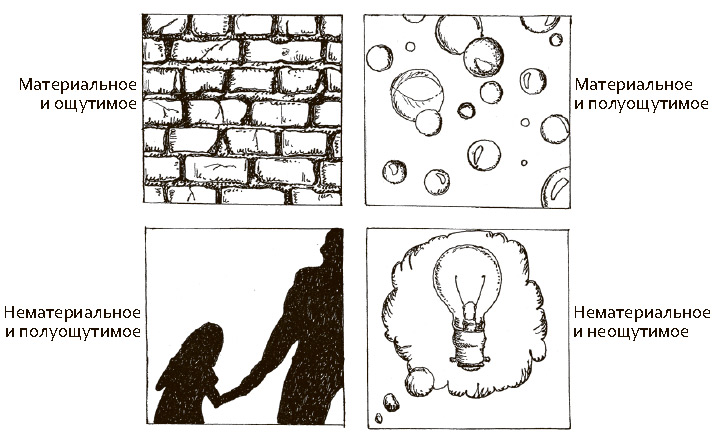 Мы не только не осознаём микроскопические компоненты макроскопических объектов, но и неправильно воспринимаем свойства самих этих объектов. Материя имеет вес и объем, но человек от природы не умеет определять их. Он может только прикинуть тяжесть (ощущаемый вес) и величину (видимый объем). В тяжести сливается собственно вес и плотность: одинаково весящие предметы будут восприниматься по-разному, если плотность у них разная (например, пятикилограммовый стальной брусок кажется тяжелее, чем пять килограммов пенопласта). Величина отличается тем, что объем в нем сочетается с площадью поверхности. Предметы с тем же объемом, но с разной площадью поверхности могут показаться разными по величине: скомканная простыня выглядит больше, чем аккуратно сложенная. Из-за своей субъективной природы тяжесть и величина меняются не так, как измеряемый вес и объем. У любой материи есть вес, но не у всякой есть ощущаемый вес (пример – снежинки и пыль). Аналогично объем есть у любой материи, но он не всегда видимый (пример – гелий и пар). Эта группа восприятий[40]40