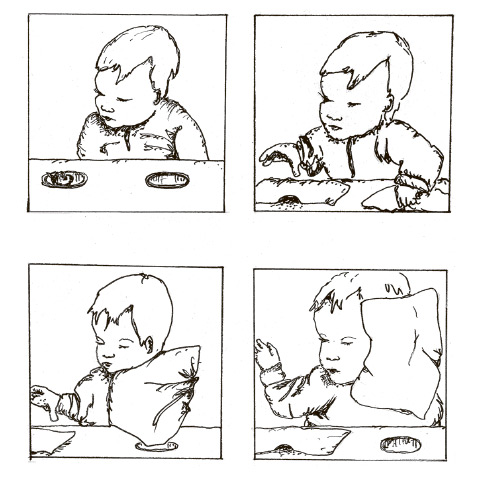 Рис. 2.3. Ребенок на рисунке ищет спрятанный предмет (накрытую игрушку) в неправильном месте (справа). Что интересно, иногда дети смотрят в правильном направлении (влево), но тянутся при этом не туда