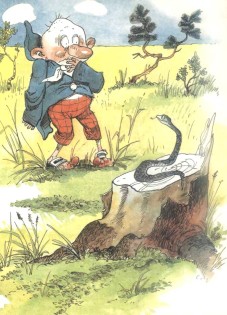 Но, подойдя к пню, Полботинка едва сдержал крик. Снова гадюка! Свернулась кольцом на пне, греется на солнце. Полботинка охватила дрожь. Почему именно ему, Полботинку, всё время попадаются змеи? Пусть бы они искали Моховую Бороду. Ведь Моховая Борода их лучший друг. Кто знает, что он теперь делает? Нашёл ли уже Муфту? Однако какое ему, Полботинку, до этого дело? У него теперь свои заботы.