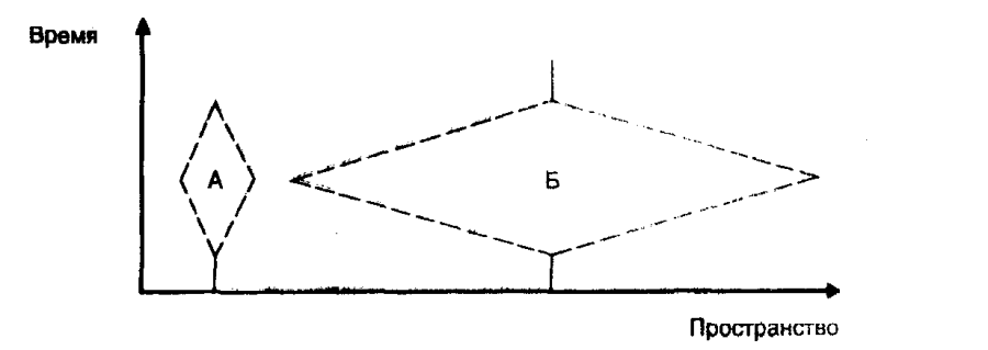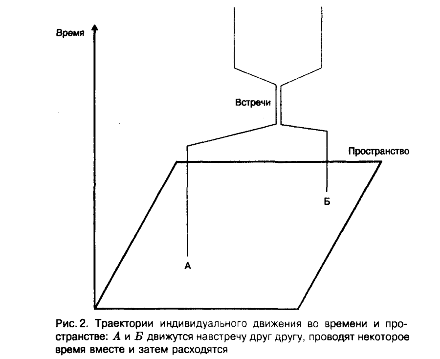 Очень простой пример. Два индивида, назовем их А и Б, живут в разных районах города. Их пространственно-временные пути в указанный день приводят их на определенное время в контакт друг с другом в точке Х — возможно, они встретились в кафе или ресторане, и побеседовали, – после чего пути их расходятся, и каждый занимается своими делами в разных местах. Если зафиксировать эти типичные действия, можно составить “пространственно-временную картину” их жизни. Таким образом, мы можем сложить действия в пространстве и времени в мозаику, которая составляет жизнь городских районов (см. рис.).