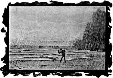 Наконец он глубоко вздохнул и оглянулся кругом. Насколько надвинувшиеся тучи, туман и дождь позволяли разглядеть предметы, ему удалось заметить с одной стороны отвесную скалу, с другой же взгляд тонул в безбрежном водном пространстве.