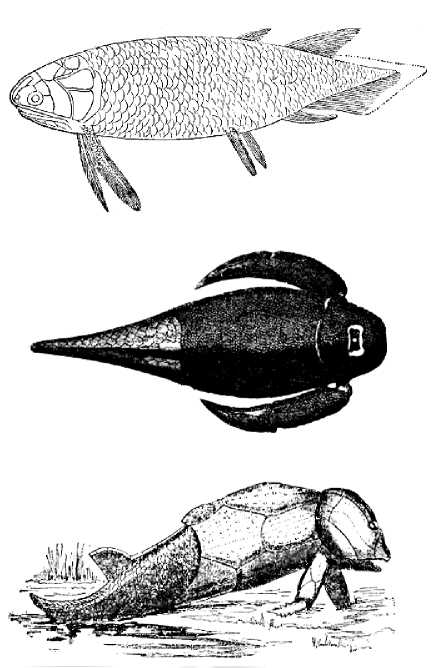 Что было в них истинно девонского, не сохранилось до нашего времени. Гигант в броне дитихтис, с подвижной головой, имевшей метр в длину, спорил тогда из-за пальмы первенства с крупнейшими из акулоподобных. Напрасно было бы также искать теперь таких странных и причудливых рыб, как птерихтис и многие другие, которые наводняли тогдашние моря. Голова и туловище этих удивительных созданий были покрыты плотными щитками, представлявшими крепкий панцирь и защищавшими их от ударов врагов.