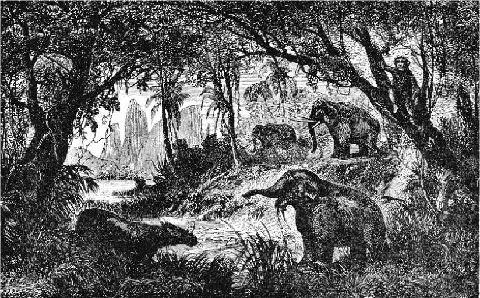 Вдруг его счет прервало глухое рычание. Не успело оно заглохнуть, как среди мастодонтов поднялся невообразимый шум и переполох, и они беспорядочно рассыпались по лесу. Со всех сторон затрещали ветви; тяжелое дыхание, сопение, хлопанье ушами, трение тел о стволы деревьев, глухое мычание и отрывистый рев слились в один страшный, оглушительный шум.