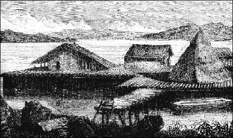 Профессор одним взглядом обнял все эти подробности. Он не отдавал себе еще отчета, каким чудом он очутился в челноке, – взгляд его блуждал по синим волнам и наконец остановился на другом береге. Там зеленели луга, опоясанные темными лесами. Около берега, среди водных зарослей подымалось несколько построек на сваях. Они были так близко, что геолог различал узкие мостики, соединявшие эти домики с берегом. Вид этих домиков сразу отрезвил геолога, и он в одно мгновение сообразил, что видит перед собою надводное поселение, так называемые свайные постройки нового каменного века. Вдруг взгляд его упал на пестрые лица молчавших гребцов. Он присмотрелся к ним и изумленно вскрикнул. Один из гребцов был лорд Пуцкинс, другой – его верный Станислав.