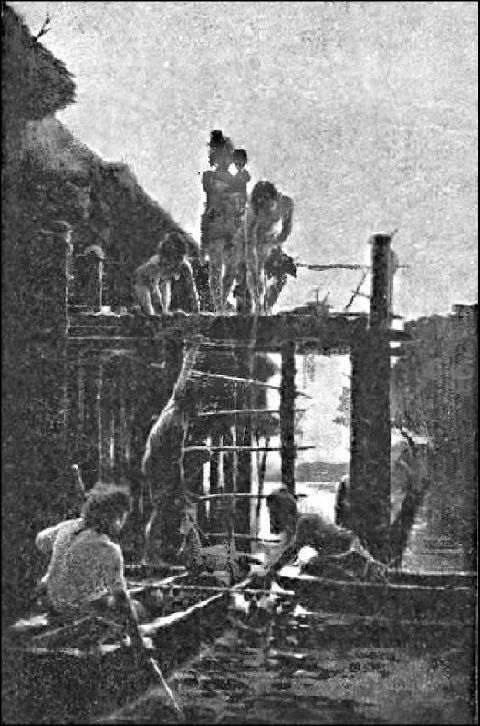 Станислав греб что было сил, и с каждой минутой деревушка обрисовывалась все яснее. Можно уже было различить лица людей, не замечавших за делом приближения челнока. Профессор искал глазами несчастную жертву. Ее нетрудно было заметить. На некотором отдалении от шумной толпы он увидел молодую девушку, облокотившуюся о плечо молодого дикаря. Девушка громко рыдала, а дикарь с мрачным отчаянием смотрел в землю. Общий шум, как и прежде, покрывал от времени до времени чей-то мощный, властный голос. Путешественники наши, предводимые неустрашимым лордом, вышли из челнока и очутились в самой середине деревни. Шум внезапно смолк. Поселяне заметили чужие лица. Лорд Пуцкинс быстро подошел к девушке и, положив ей руку на голову, другой рукой указал на сваи, выразительными жестами стараясь дать понять дикарям, что они должны отказаться от своего намерения. Минута немого изумления, и вдруг все заволновалось, зашумело, и несколько человек бросились на лорда. Станислав подбежал на помощь, но их обоих повалили на землю и связали веревками. Такая же судьба постигла и профессора. Дикарями овладела дикая радость. Они поочередно подходили к пленникам, плевали им в лицо и грозили им своими тяжелыми топорами. Наконец по команде самого старшего один из дикарей взвалил лорда Пуцкинса к себе на плечи и быстро отнес его к основанию постройки, под бревно; затем он взял таким же образом Станислава и геолога и посадил их в нескольких десятках шагов от лорда. Под радостные крики девушка упала к ногам старика, который даровал ей жизнь и волю. Затем зазвенели бубны, и два рослых дикаря стали перерезать веревку, на которой висело тяжелое бревно.